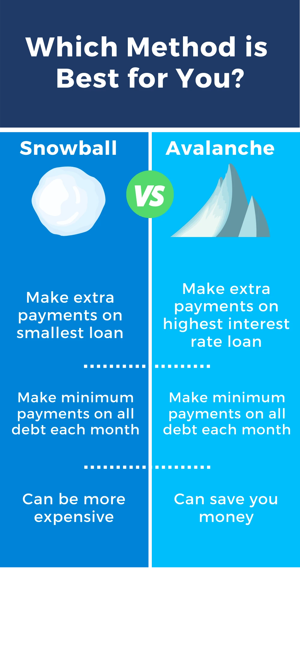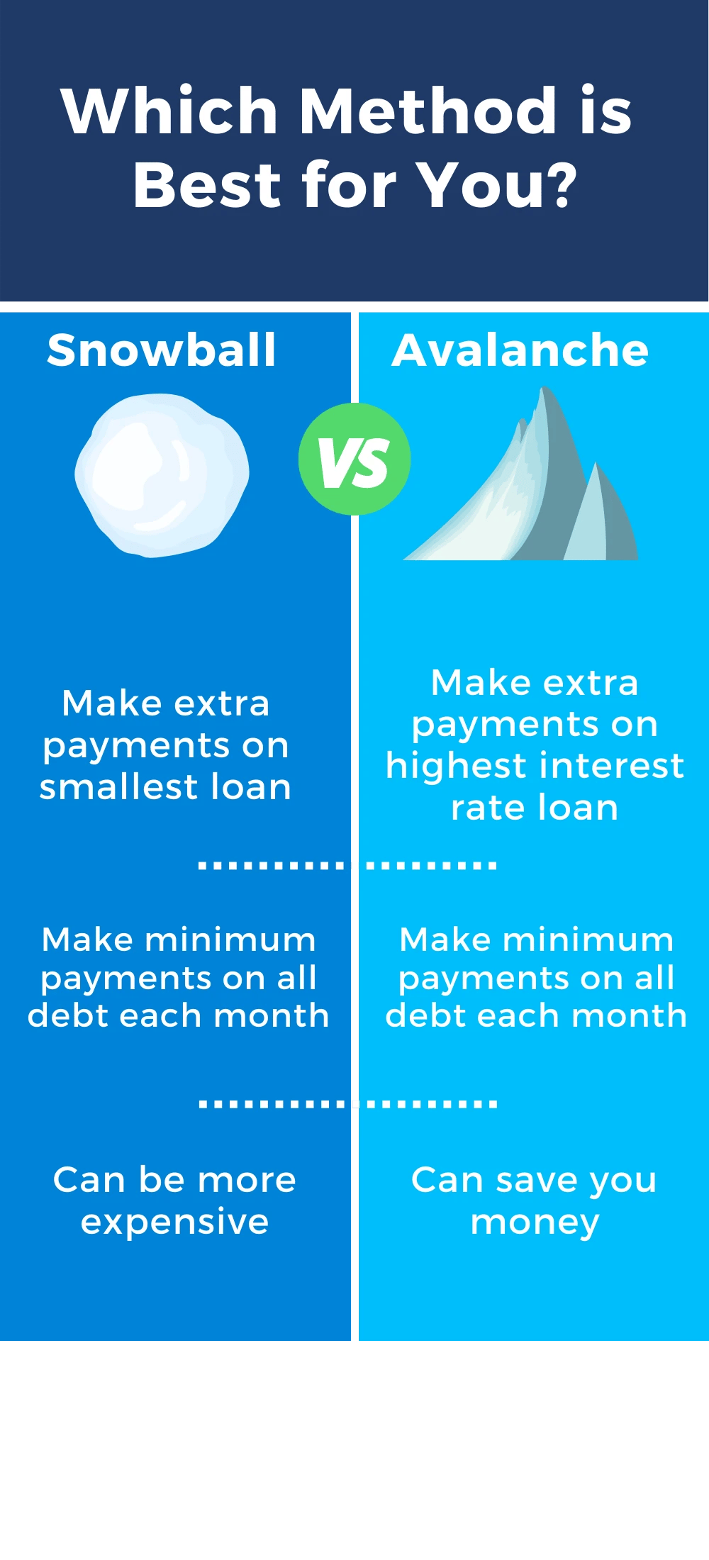 The debt snowball method aims to eliminate your smallest debts first. To follow this method, make minimum payments on all your debts each month. Then make extra payments on your smallest debt. Once you finish paying your smallest debt, you do the same thing to the next smallest one. With the snowball method, it's easier to get excited about paying off your debt. You see the results faster than you would using the avalanche method. The biggest downside of the debt snowball is it can be a more expensive method. More interest will add up and end up costing you more in the long run. Although this repayment method can cost more, it has been proven to help people pay off debt more successfully. It's all about small wins!