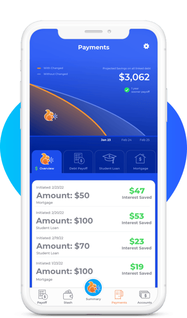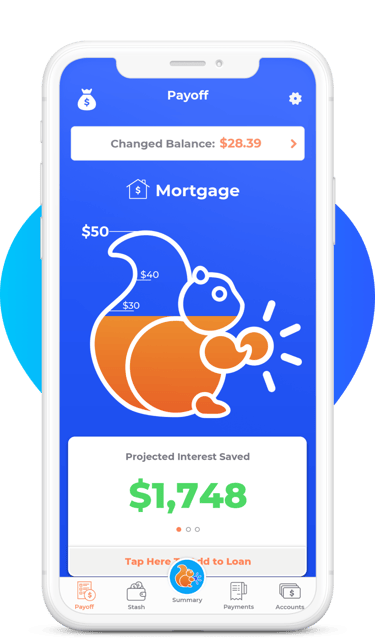 The Payoff screen is your savings and transfer hub. Track your savings, view your transfers, and watch as you get closer to a payment! Transfers are made in $5 increments based on your savings. Once your Changed squirrel fills up, a payment is sent automatically. Set it, forget it, and save!